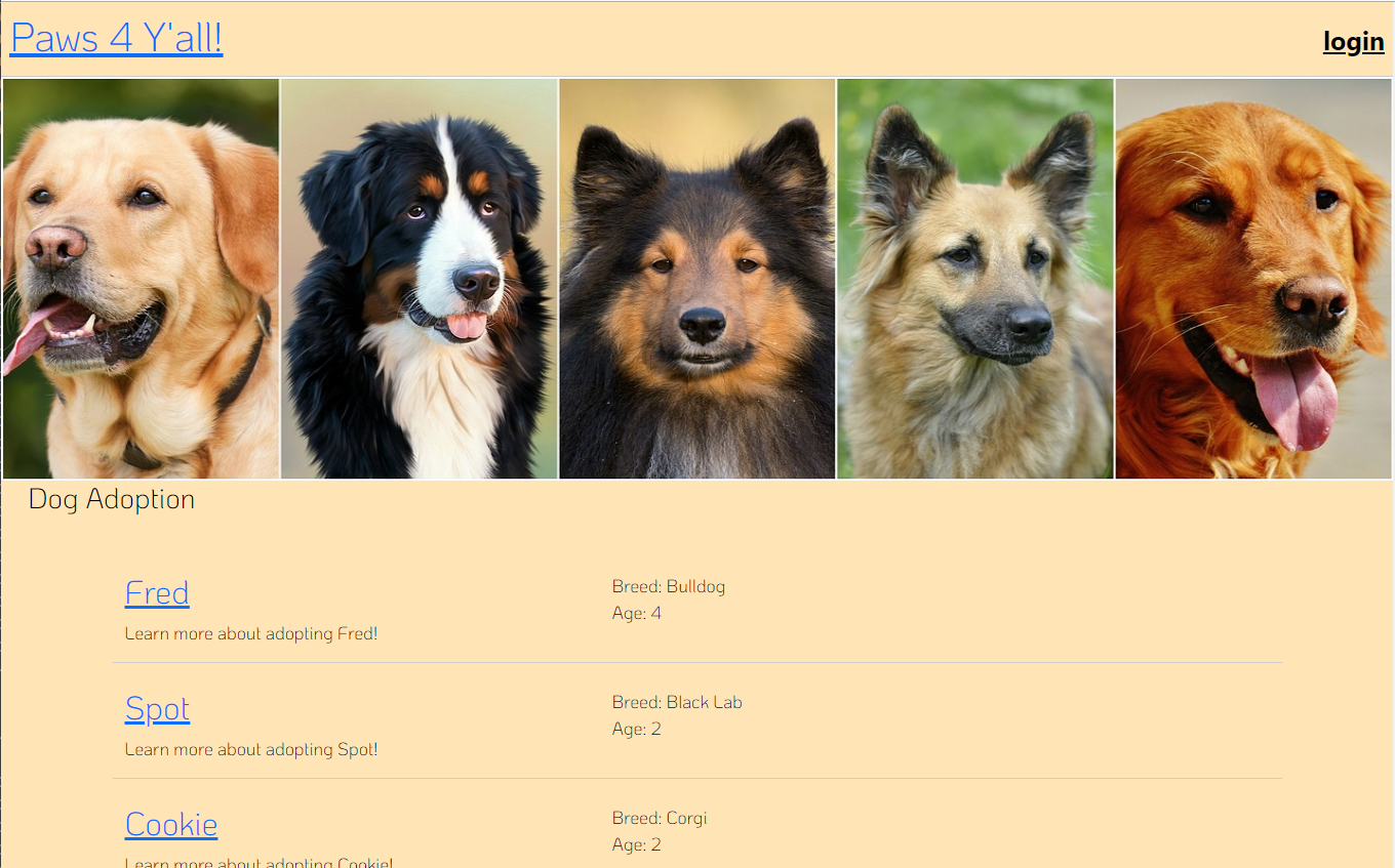 This website was created to facilitate dog adoption. Users are able to view profiles for dogs that have been put up for adoption. Users can also create an account(or login with and existing account) and create new posts for dog adoption. Posts include basic information about the dog along with a picture(stored in Cloudinary with the URL saved in a MySQL database)